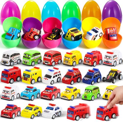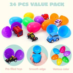 - Super valor. Ovos de Páscoa preenchidos incluem 24 peças de mini carrinhos de puxar para trás no conjunto de brinquedos. Vem em 8 cm para o seu tamanho, o que é melhor para brincadeiras infantis.
