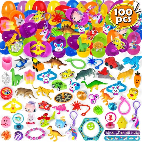 - ?100 Ovos de Páscoa pré-cheios com brinquedos dentro? Um pacote valioso para seus eventos de caça aos ovos de Páscoa. Cada ovo de páscoa premium é pré-preenchido com um brinquedo de Páscoa para crianças, como anel de Páscoa, anel de borracha de unicórnio, carro de puxar, pulseira de Páscoa, mochi mochi, pulseira de tapa, prendedor de dinossauro, borracha, chaveiro de unicórnio, bola de ioiô, pulseira de meninas, bola saltitante e brinquedo de dinossauro, etc. Nem todos os brinquedos são mostrados na imagem do produto. Mais para descobrir nos ovos!