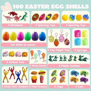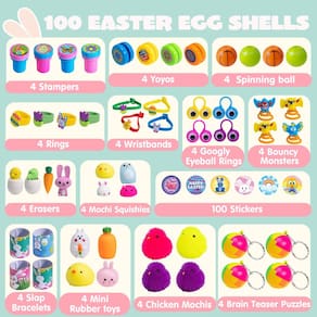 - Pacote super econômico: Nosso ovo pré-cheio de Páscoa inclui 100 peças de cascas de ovos de Páscoa de 6 cm e 100 adesivos, brinquedos incluindo mochis, ioiós, pulseiras de stap, borrachas de alimentos, mini brinquedos de borracha, blocos de madeira, piões, selos, anéis, adesivos, dinossauros, bolas de futebol, anéis divertidos de globo ocular ondulado, molas, mãos pegajosas, chaveiros, carros, monstros saltitantes.
