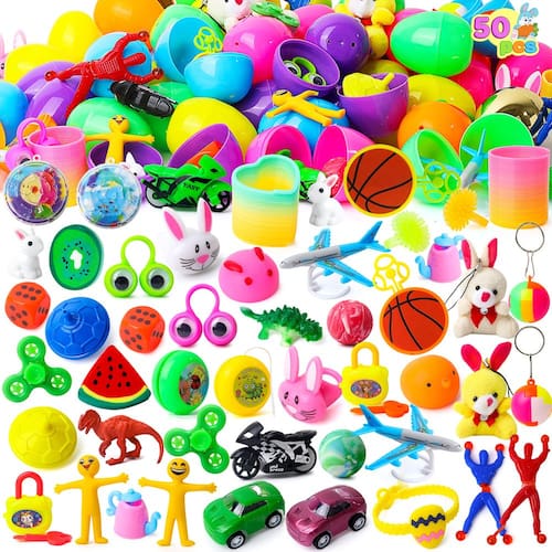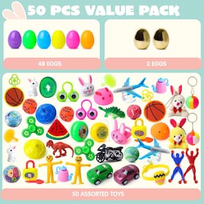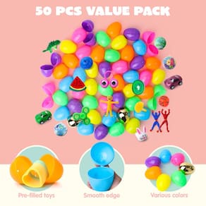 - Pacote super econômico: mergulhe na melhor experiência de Páscoa com nosso pacote de super valor! Você receberá 48 pacotes de cascas coloridas de ovos de Páscoa de 6 cm e 2 ovos de plástico preenchidos com ouro com 50 adesivos (os brinquedos incluem brinquedo Mochi, pulseiras de Páscoa, carros de puxar, pelúcia de coelho, anéis, borracha animal, ioiós, piões, chaveiro e dinossauro, etc.). É a solução perfeita para diversão de Páscoa sem complicações!