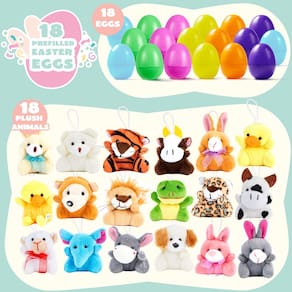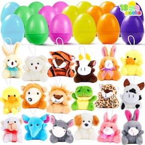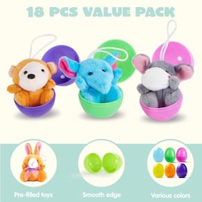 - Pacote com supervalor. Nosso conjunto de ovos de Páscoa pré-cheios inclui 18 diferentes animais de pelúcia. Ovo de Páscoa de 5,5 cm preenchido com chaveiro de animal de pelúcia para crianças e meninas.