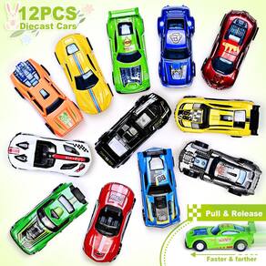 - ?Horas de diversão para crianças? Existem 6 tipos diferentes no total de 12 carros de metal fundido no pacote. Caixa de metal, muito resistente e durável. Basta puxá-lo para trás, ele vai dirigir para longe em alta velocidade. As crianças vão adorar brincar com carros de corrida de metal fundido. Presente perfeito de brinquedo de Páscoa para meninos e crianças.