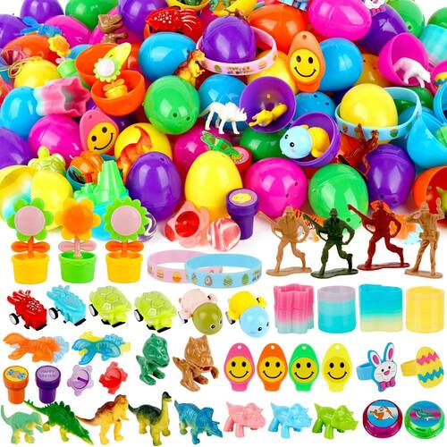 - Os ovos de Páscoa pré-cheios têm cascas de ovo mais grossas e em cores diversas e sólidas brilhantes. Você pode encher cada cesta de Páscoa com tantos ovos de Páscoa e uma variedade de mini brinquedos populares que podem fazer as crianças brincarem mais felizes