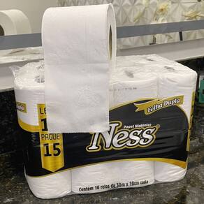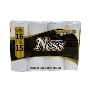 1 Pacote de Papel Higiênico Ness com 16 rolos de 30 metros cada.