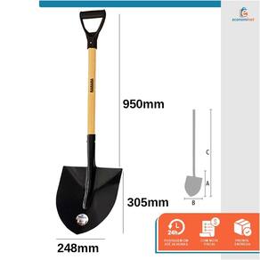 Pá de bico com cabo 3 RamadaFerramentas utilizadas principalmente em atividades agrícolas e na construção civil. Pás de bico são para juntar e carregar materiais.• É temperada em todo o corpo da peça, proporcionando maior resistência e menor desgaste durante o uso.• Recebe pintura eletrostática a pó, que tem uma melhor apresentação visual e maior proteção contra oxidação• Cabo com acabamento envernizado, para um melhor acabamento e apresentação do produto. A camada protetora em verniz incolor realça sua tonalidade, concedendo brilho e um toque mais liso ao produto.• Possui empunhadura plástica ergonômica.As pás são produzidas com aço SAE 1008 com 1,2mm e 1,5mm de espessura, estampadas e pintadas na cor preta.• Nº3 com cabo curto de madeira 68cm.• Empunhadura “Y” plástica Standard.Dimensões conforme imagem:A(mm): 305B(mm): 248C(mm): 950Modelo: 08921-E EAN: 7896438089211 Marca: Ramada