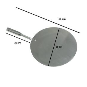 r: a pá tem comprimento total: 56cm, o comprimento do cabo é 22cm, diâmetro do disco de alumínio é de 35cm. Marca: Issi Grill