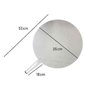 r: a pá tem comprimento total: 53cm, o comprimento do cabo é 18cm, diâmetro do disco de alumínio é de 35cm. Marca: Issi Grill