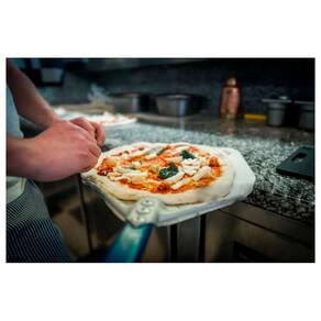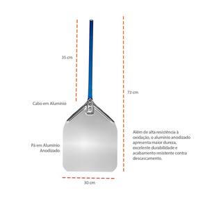 Pá para pizza com cabo. A pá é perfeita para enfornar pizza no forno a lenha, transformando sua cozinha em uma pizzaria artesanal. A pá foi produzida em aluminio anodizado, de alta resistencia à oxidaçao, excelente durabilidade e acabamento resistente contra descascamento. O destaque desta pá é sua borda rebaixada, suave e regular, que torna o processo de pegar a pizza na bancada de trabalho uma tarefa simples e sem esforço. E para garantir segurança e estabilidade maxima, a junçao entre o cabo e a cabeça da pá é reforçada por tres grandes rebites em linha, eliminando qualquer vibraçao e proporcionando um conforto incomparavel durante o uso.