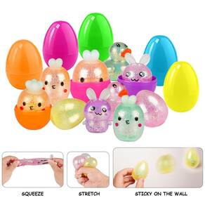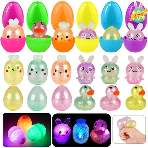 - ?Pacote super econômico?Você receberá: 12 ovos de páscoa recheados em 6 lindas cores, 12 peças de brinquedos macios que brilham no escuro em 4 designs fofos, 12 cartões de pistas de papel. Quantidade suficiente para o seu uso.
