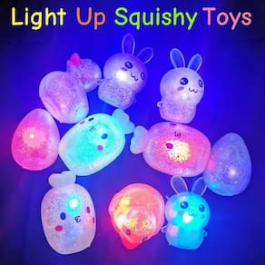 - ?Brinquedos macios divertidos para crianças?Estes brinquedos macios foram projetados em formas fofas de ovo/cenoura/coelho/pato, que não apenas podem ser espremidos e esticados para fornecer algumas necessidades sensoriais para crianças, mas também podem ser agitados para piscar luzes vermelhas e azuis por alguns segundos (não são necessárias pilhas extras) todas as vezes, muito coloridos, brilhantes e atraentes, o que trará muita diversão para as crianças. E atende aos padrões de brinquedos dos EUA, certificação CPC.