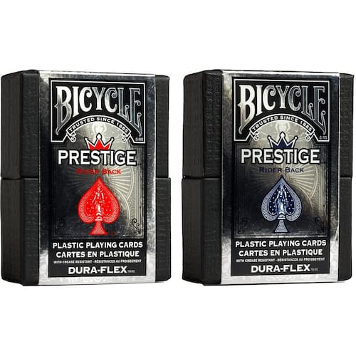 - O pacote inclui 2 baralhos de cartas de baralho de plástico impermeável Prestige: este pacote inclui 1 baralho vermelho e 1 baralho azul de cartas de baralho Bicycle Prestige