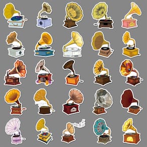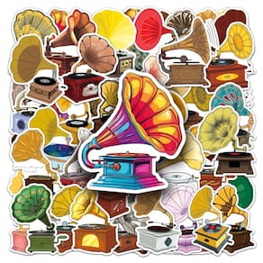 Pacote de 50 adesivos de gramofone, decalques de desenhos animados com fonógrafo retrô vintage, adesivos de vinil impermeáveis para laptop, álbum de recortes, diário, capa de telefone, artesanato em resina DIY, decoração com tema musical