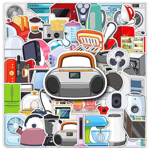 Cute Appliance Theme — Inclui 50 decalques de vinil coloridos e em estilo cartoon de eletrônicos domésticos de uso diário, como TVs, geladeiras, torradeiras, ventiladores, chaleiras e liquidificadores — divertidos e cheios de personalidade. Vinil impermeável e durável — Feito de vinil impermeável de alta qualidade que resiste ao desgaste, desbotamento e arranhões; fácil de descascar e aplicar sem deixar resíduos pegajosos. Diversão para fazer você mesmo e escrever no diário — Perfeito para decorar álbuns de recortes, diários com marcadores, laptops, capas de telefone, garrafas de água, agendas e outros itens pessoais com um tema doméstico peculiar. Designs brilhantes e divertidos — Uma ótima mistura de aparelhos clássicos e modernos, renderizados em cores vivas e contornos simples, ideais para uma estética alegre e alegre. Faixa de tamanho versátil — Cada adesivo mede de 5 a 8 cm, compacto o suficiente para layouts em camadas, mas detalhado o suficiente para se destacar em qualquer superfície.