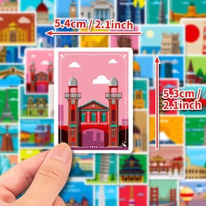Material: papel e vinil Peso: 30-60 g Tamanho: 3-6 cm Quantidade: 50 unidades Tema World Landmark — Contém 50 adesivos de vinil projetados como ilustrações coloridas em estilo pôster de arquitetura icônica, como Torre Eiffel, Torre Inclinada, Big Ben, Estátua da Liberdade, Taj Mahal e muito mais. Duráveis e impermeáveis — Feitos de material de PVC de alta qualidade, esses decalques são à prova d'água, resistentes ao sol e de longa duração, mantendo os designs brilhantes em ambientes internos ou externos. Aplicações versáteis — Perfeitas para laptops, telefones, notebooks, álbuns de recortes, skates, guitarras, garrafas de água, malas e projetos de bricolage. Estilo de arte inspirado em pôsteres — Projetado com cores fortes e estética gráfica de pôster, ideal para viajantes, estudantes e qualquer pessoa que ame a cultura e a arquitetura mundiais. Fácil de aplicar e remover — os adesivos são descascados facilmente, colados com firmeza e removidos de forma limpa, sem deixar resíduos, permitindo uma decoração e um reposicionamento flexíveis. Tema World Landmark — Contém 50 adesivos de vinil criados como ilustrações coloridas em estilo pôster de arquiteturas icônicas, como Torre Eiffel, Torre Inclinada, Big Ben, Estátua da Liberdade, Taj Mahal e muito mais. Duráveis e impermeáveis — Feitos de material de PVC de alta qualidade, esses decalques são à prova d'água, resistentes ao sol e de longa duração, mantendo os designs brilhantes em ambientes internos ou externos. Aplicações versáteis — Perfeitas para laptops, telefones, notebooks, álbuns de recortes, skates, guitarras, garrafas de água, malas e projetos de bricolage. Estilo de arte inspirado em pôsteres — Projetado com cores fortes e estética gráfica de pôster, ideal para viajantes, estudantes e qualquer pessoa que ame a cultura e a arquitetura mundiais.