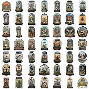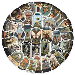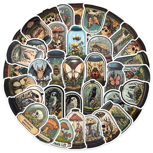 Mystical Jar Designs — Inclui 50 adesivos ilustrados de forma exclusiva que mostram cenas fantásticas de insetos, caveiras, pássaros, cogumelos e florestas góticas em garrafas com uma atmosfera misteriosa e vintage. Material de vinil durável — Feito de vinil impermeável e resistente às intempéries, com forte adesão e tinta que não desbota, perfeito para uso decorativo interno e externo. Perfeito para amantes da estética sombria — Ideal para fãs de bruxaria, goblincore ou arte gótica inspirada na natureza que desejam personalizar seus laptops, garrafas, guitarras ou diários. Fácil de aplicar e sem resíduos — Esses decalques são fáceis de retirar e aplicar e não deixam marcas adesivas, o que os torna ótimos para projetos de decoração DIY reposicionáveis. Tamanho compacto e arrojado — Cada decalque mede entre 5 e 8 cm, oferecendo a escala certa para visibilidade e ainda cabendo em diários, estojos ou artesanato.