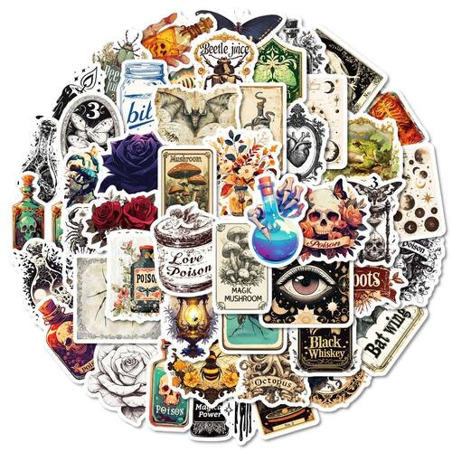 Material: papel e vinil Peso: 30-60 g Tamanho: 3-6 cm Quantidade: 50 unidades Tema gótico vintage 50 peças de adesivos de estilo retrô com frascos de poções, cogumelos, morcegos, rosas, caveiras e símbolos místicos, adicionando uma estética sombria aos seus itens pessoais. Material de vinil premium Feito de vinil impermeável durável, resistente ao desbotamento e arranhões, perfeito para decoração duradoura em diferentes superfícies lisas. Aplicação peel-and-stick fácil de usar e removível, facilmente removível sem deixar resíduos pegajosos, adequada para laptops, álbuns de recortes, garrafas de água e diários. Decoração criativa DIY Ideal para personalizar skates, guitarras, malas, capas de telefone, capacetes e notebooks com uma estética gótica vintage. Perfeito para amantes do gótico Projetado para adolescentes e adultos que gostam de obras de arte em estilo retrô, místico e bruxo para personalizar seus itens essenciais do dia a dia.