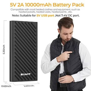 --Mais sobre BIUMVP Battery Pack-- ? ?Aviso? Adequado para porta USB de 5 V, não para porta CC de 7,4 V/12 V. Confirme se o colete/jaqueta aquecida é uma porta USB antes de comprar. Em conformidade com os padrões de bagagem de mão das companhias aéreas para que você possa carregá-la a bordo sem se preocupar e viajar pelo mundo a qualquer momento. ?Compatível com uma variedade de dispositivos eletrônicos inteligentes, como laptops, iPads, fones de ouvido Bluetooth, relógios inteligentes, ventiladores USB, iPhones, telefones Android, etc. ?Especificações? Peso: 167 g Bateria: bateria de polímero de lítio Capacidade: 10000mAh / 37Wh Dimensão: 13,5 x 1,6 x 6,8 cm Saída: 5V 2A (USB C apenas para entrada) Conteúdo da embalagem: - Bateria traseira x 1 peça - Cabo de carregamento x 1 peça - Manual x 1 peça - ?Aviso?Adequado para porta USB de 5 V, não porta CC de 7,4 V/12 V. Confirme se o colete/jaqueta aquecida é uma porta USB antes de comprar. - ?Leve, grande potência?É especialmente projetado para colete aquecido, jaqueta aquecida, calça aquecida, casaco aquecido e outras roupas/roupas aquecidas (saída USB 5v 2a), pode carregar vários tipos de roupas aquecidas por 5 a 6 horas. - ?Design ultrafino?A capacidade de 10.000 mAh é armazenada em um corpo incrivelmente fino que é 30% mais fino, 17% menor, 25% mais leve do que seus tipos. Você pode facilmente levá-lo para qualquer lugar sem se sentir volumoso e pesado. - ?Banco de potência de saída dupla?Há entrada dupla tipo C e micro (5V/2,1A) e 2 portas de saída USB que podem carregar dois dispositivos ao mesmo tempo e você pode compartilhá-los com amigos. - ?Seguro certificado?Com certificação UL, FCC, RoHS e CE; o sistema de segurança multi-Protect integrado protege seus dispositivos contra excesso de corrente, superaquecimento e sobrecarga, etc.
