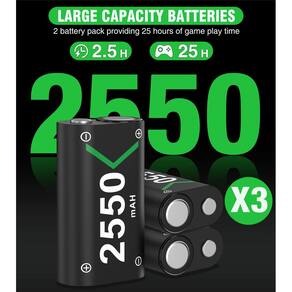 bateria recarregável compatível com a série xbox one/xbox - ??Bateria de longa duração?A bateria atualizada do controlador de alta capacidade para a série xbox pode durar até mais de 25 horas de tempo de jogo, mesmo com uso intenso de videogames. Você continuará jogando e não precisará perder tempo trocando a metade da bateria do jogo. Nunca se preocupe com o fato de ela morrer no meio do jogo - ??3 soluções de carregamento para a bateria do Xbox?Não há limitação no método de carregamento com 3 portas de carregamento do carregador Xbox, ? Carregar pelo console Xbox ou pela tomada de carregamento USB com o USB A embutido. ? Carregar pelo adaptador USB ? Carregar com seu próprio cabo de carregamento tipo C ou micro, o design especial das baterias do controlador Xbox permite que você carregue em qualquer lugar - ??2,5 horas de carregamento rápido do Xbox Carregamento?Com o chip inteligente atualizado e as interfaces de carregamento sensíveis do Xbox Charging, leva apenas 3 horas para carregar totalmente as 2 baterias do Xbox One. A luz vermelha indica carregamento e fica vermelha para verde quando totalmente carregada. É tão pequena de segurar e não ocupa muito espaço que você pode colocá-la sobre a mesa e ela ocupa apenas um pequeno canto - ??Mais de 2000 vezes a vida útil de reciclagem e proteção contra sobrecarga?A bateria recarregável da série Xbox usa a tecnologia mais avançada. O carregador e o kit de bateria podem proteger o controle de sobrecarga, sobrecorrente, sobretensão e temperatura. Portanto, seu controle remoto Xbox One/Xbox Series X|S seria 100% seguro durante o carregamento. O conteúdo recarregável de Ni-MH ainda retém 100% da energia após a recarga de mais de 2000 vezes a vida útil da reciclagem. Diga adeus às pilhas AA descartáveis de agora em diante - ??Fácil de usar e instalar?Você recebe uma bateria de carregador supercompleta para Xbox One/Xbox Series X|S e as baterias são compatíveis com a capa autêntico do Xbox, então você não precisa se preocupar com o uso.-- ? Baterias Xbox recarregáveis de 3x2550mAh, ? 1 carregador de controle Xbox. É uma boa escolha para sua vida útil de jogo no Xbox, e nós o ajudaremos a substituí-la se você encontrar algum problema