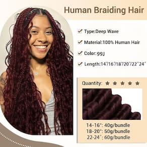 - [6-8 99J cabelo humano ondulado profundo cabeça inteira] Cabelo humano encaracolado para tranças boho está disponível em feixes de 35-61 cm, cabelo humano molhado e ondulado 35.6-40.6 cm 1 pacote é 40g, 45.7-50.8 cm 1 pacote é 50g, 56-61.0 O pacote cm 1 é 60 g. O cabelo humano para trançar mulheres negras tem comprimento e peso reais, qualidade garantida. Se você gosta de cabelo humano de cabeça inteira para tranças boho de 61 cm, recomendamos que você compre de 6 a 8 mechas de cabelo humano trançado de ondas profundas para tranças boho sem nós.