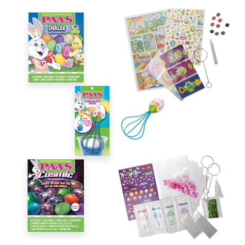 - Pacote completo de decoração de ovos de Páscoa – Inclui 1 kit de ovos de luxo, 1 kit de tingimento de ovos cósmicos e PAAS Whiskers para facilitar o manuseio dos ovos.