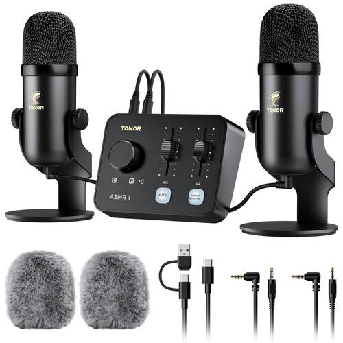 Pacote de equipamento de microfone TONOR ASMR com interface de áudio, áudio estéreo 3D imersivo, microfones de condensador duplo com mixer de áudio, som nítido, controle de volume, com pára-brisas peludos, conjunto para ASMR, preto