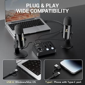 - Ampla compatibilidade: inclui um cabo USB para tipo C e USB de ponta dupla; compatível com Sistemas macOS, Windows e Android; adequado para uso com computadores e telefones - Estéreo ajustável Som: dois microfones nos canais esquerdo e direito permitem a gravação estéreo para uma experiência ASMR imersiva; os botões da placa de som ajustam a proporção dos canais esquerdo e direito, alcançando o equilíbrio ideal