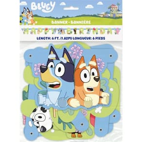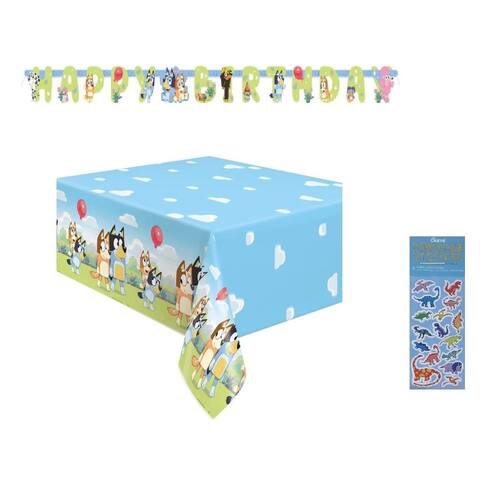 O pacote de suprimentos para festa de aniversário Bluey inclui 1 mesa de plástico de 137 x 213 cm e 1 faixa de feliz aniversário de 1,8 m de comprimento. - O pacote de artigos para festa de aniversário Bluey inclui: - 1 toalha de mesa de plástico 137 x 213 cm, - 1 faixa de feliz aniversário de 1,8 m de comprimento, - 1 folha de adesivo de dinossauro (não adesivos azuis).
