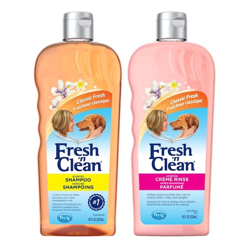 - XAMPÔ FRESH 'N CLEAN – Este shampoo sem sabão à base de plantas lava suavemente a sujeira e a sujeira. Com vitamina E e aloe vera, a fórmula com pH equilibrado é projetada para a pele sensível do cão. Ele retém a umidade para uma camada macia e gerenciável.