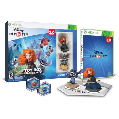 A caixa de brinquedos Disney Infinity 2.0 é para fãs de Disney Infinity interessados nos aspectos de criação da Toy Box e inclui o jogo Disney Infinity 2.0 Edition (que também está incluído no pacote inicial de super-heróis da Marvel), figuras de Merida de Brave e Stitch de Lilo & Stitch, juntamente com dois discos de energia. *O DLC (conteúdo para download) pode não estar incluído e não tem garantia de funcionamento*