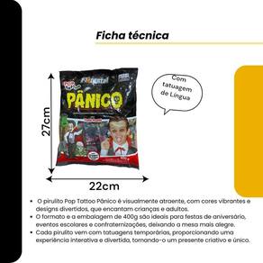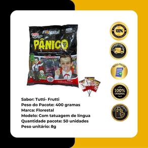 Contém: 1 pacote de 400 g de pirulitos Pânico pop que tatuam temporariamente a língua com um desenho . Pirulito sabor Tutti-frutti, colorido e aromatizado artificialmente. Pirulito com tatuagem de língua Pânico O pirulito tattoo é uma nova sensação: ele é capaz de tatuar temporariamente a língua com uma figura. Para conseguir o melhor efeito, pressione o pirulito por um tempo sobre a língua, sem mover. Ótimo para distribuir a crianças no final da festa, pois irão se divertir muito As estampas são e temáticas de acordo com o pacote. A Festa de todo mundo fica muito mais doce com guloseimas, docinhos e pirulitos. Adoce sua festa com doces para criançada. Com certeza será uma sensação entre as crianças e também entre os adultos Experiência Divertida: Destaque o diferencial do pirulito com tatuagens de língua, proporcionando uma experiência interativa e divertida que encanta crianças e provoca sorrisos. Sabor Incrível: Informe sobre os sabores deliciosos que acompanham cada pirulito, garantindo que a diversão venha com um gosto irresistível que todos adoram. Ideal para Eventos Temáticos: Enfatize que esses pirulitos são perfeitos para festas de aniversário, especialmente com o tema de princesas, adicionando um toque especial e único à celebração. Formato Atrativo: Atraia a atenção para o design charmoso e colorido dos pirulitos, que não só são gostosos, mas também atraem visualmente, tornando-os irresistíveis para os pequenos. Marca: Não Informado Ean: 7794670611644