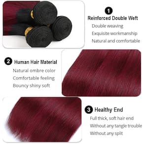 - ?Cor dos feixes de cabelo?: Feixes de 2 tons de preto a vinho, cor vermelha 1B99j, brilhante e bonito.