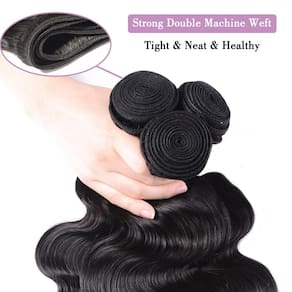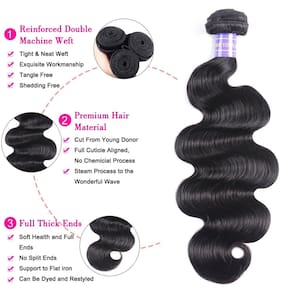 Feixes de cabelo humano - Material dos feixes de cabelo humano: Extensões de cabelo humano de grau 12A não processado, 1 pacote de cabelo ondulado, cabelo virgem brasileiro, cortado diretamente de jovens doadoras, cabelo humano real sem nenhum cabelo sintético ou animal, limpo, saudável e inofensivo. - Qualidade do cabelo humano dos feixes ondulados do corpo: mechas de cabelo humano 12A, trama de cabelo humano de trama forte de máquina dupla, sem queda, sem emaranhados, sem cheiros, pontas grossas, trama macia, trama de cabelo saltitante e brilhante com alta elasticidade, firme e limpa, cutícula unidirecional sem pontas duplas - Detalhes de cabelo humano com ondas corporais: 35,5 a 76,2 cm disponíveis em estoque, 1 pacote, cada pacote tem 95 g - 100 g, suficiente para fazer uma cabeça inteira, fiel ao comprimento e peso, cor preta natural, pode ser tingido ou descolorido como você quiser, mechas de cabelo humano, pode ser alisado ou enrolado. - Características dos pacotes de cabelo humano ondulado: feixes de cabelo humano Remy não processados vendidos diretamente pela fábrica, feixes de cabelo humano cru, cabelo ondulado, mantém bem encaracolado, adequado para fazer uma peruca completa ou aumentar o volume do seu cabelo - Mechas de cabelo humano Vida útil e sustentabilidade: em geral, mechas de cabelo humano podem durar de 6 a 12 meses, se você cuidar bem dos seus mechas de cabelo, pode durar de 1 a 2 anos