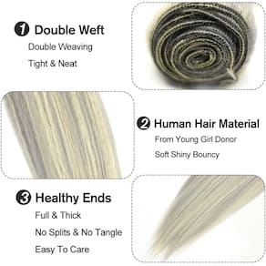 Especificações do cabelo: 1. Material do cabelo: Cabelo humano virgem brasileiro não processado de grau 8A. 2. Qualidade do cabelo: trama dupla à máquina, mechas grossas saudáveis, sem emaranhados ou quedas. 3. Tipo de cabelo: mechas de cabelo humano liso. 4. Cor do cabelo: Dois tons Pcinza/613 (cinza loiro misto). 5. Comprimento do cabelo: mechas de 30 a 86 cm, mechas grossas saudáveis, tamanhos diferentes podem atender a diferentes necessidades de cabelo. 6. Peso do cabelo: 95-100 g/pacote, geralmente 3-4 mechas de cabelo humano podem deixar o cabelo cheio. 7. Ocasião: Adequado para diferentes ocasiões, uso diário, reuniões, viagens, shows, cerimônias de formatura, casamentos, encontros e assim por diante, pode trazer mais beleza e mais charmoso! Perguntas frequentes: P1: Como reduzir o emaranhamento ou o desprendimento? A1: Cruze os dedos, desconecte a ponta, penteie suavemente o cabelo com as mãos ou penteie o cabelo. Use condicionador para deixá-lo macio e suave. Não use uma escova ou force para puxar o cabelo P2: Como lavar? Posso molhá-lo? A2: Sim, claro. Você pode lavar o cabelo regularmente com xampu em água morna, adicione um pouco de condicionador à água morna e esfregue o cabelo suavemente enquanto lava, absorva o excesso de água e penteie e deixe secar naturalmente, não exponha à luz solar. P3: Quantos mechas eu preciso para a cabeça inteira? A3: Cerca de 3 ~ 4 mechas de cabelo humano, curto então 3 mechas de 45,7 cm são suficientes, mais do que 45,7 cm 4 mechas seriam melhores. - ?Material dos mechas de cabelo humano cinza/613?Cabelo humano virgem brasileiro 100% não processado. Macio e sedoso. Parece muito natural, assim como seu próprio cabelo. - ?Tipo e cor do pacote de cabelo? Cabelo humano liso. Cor cinza/613, cinza de dois tons misturado com loiro. - ?Vantagem do conjunto de destaques? Feixes de cabelo humano de trama dupla à máquina, é apertado e arrumado. Muito grosso, sem emaranhamento, sem queda, cabelo saudável, muito macio e bonito. - ?Peso e comprimento do cabelo?30 a 86 cm, 95 a 100 g/mecha. - ?Adequado para qualquer ocasião?Perfeito para uso diário, reuniões de amigos, celebrações de férias, compras e encontros, e assim por diante. Se você tiver alguma dúvida, sinta-se à vontade para entrar em contato conosco a qualquer momento.