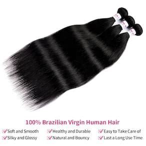 Feixes retos Material de cabelo humano: feixes de cabelo humano brasileiro 100% não processados, cortados diretamente de jovens doadores, macios, sedosos, limpos e saudáveis - 1. Feixes retos Material de cabelo humano brasileiro: feixes de cabelo humano brasileiro 100% não processados, cortados diretamente de jovens doadores, macios, sedosos, limpos e saudáveis - 2. Qualidade dos feixes de cabelo humano humano liso de 12 A, trama dupla, cheios e grossos, com queda mínima de emaranhados, lata Seja enrolado, branqueado e estilizado como seu próprio cabelo - 3. Os feixes de cabelo humano apresentam comprimento e peso: fiel ao comprimento e ao peso total. 14-28 polegadas para Pacotes de cabelo brasileiros, 100 g/pacote (3,5 onças/pacote), 3 pacotes podem ser suficientes para fazer uma cabeça cheia - 4. Pacotes de cabelo humano liso Penteado e ocasião: feixes de cabelo liso criam com facilidade e rapidez seu penteado favorito. Adequado para feriados, festas de aniversário, cerimônia de formatura, casamento, tornam você a mais charmosa; também podem ser utilizados como presentes para familiares ou amigos - 5. Atendimento ao cliente: temos nossa própria fábrica de cabelos, Se você tiver algum problema com nosso produto, faremos o possível para lhe proporcionar uma experiência de compra satisfatória