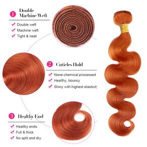 Especificações do cabelo: 1. Material do cabelo: Extensões de cabelo humano real 8A, cabelo virgem não processado. 2. Textura do cabelo: mechas de cabelo humano ondulado. 3. Cor do cabelo: Os mechas são cor laranja gengibre. 4. Qualidade do cabelo: Trama dupla forte, sem pontas secas, sem rachaduras, queda mínima, sem emaranhados, apertada e limpa, grossa, extremidades saudáveis, pode ser enrolado, alisado, fácil de cuidar. Duram mais. 5. Comprimento do cabelo: 30 a 86 cm de comprimento misto. 6. Peso do cabelo: 100 g/pacote, pacotes de 3 pacotes. 7. Ocasião: Perfeito para uso diário, Halloween, shows, festas temáticas, casamentos, encontros e assim por diante. Faz você parecer jovem e bonita. Perguntas frequentes: P1: Cabelo quanto tempo dura? R1: A duração do cabelo depende de como você o mantém. Trate-o como seu próprio cabelo e cuide muito bem dele. Sugerimos que você use um bom xampu e condicionador para condicionar seu cabelo uma vez por semana. Não use secador ou muito calor. P2: Como evitar emaranhamento ou queda de cabelo? R2: Lave seu cabelo com xampu e condicionador de alta qualidade; Penteie o cabelo suavemente com pente de dentes largos; peça ao estilista com bons produtos para cabelo para tingir e descolorir o cabelo; consulte seu estilista antes de tentar qualquer técnica de estilo se você não tiver certeza. P3: Como medir o comprimento do cabelo? A3: A maneira como medimos o cabelo é esticá-lo, depois medimos de cima a ponta, em vez de medi-lo diretamente. - ?Material do pacote laranja gengibre?: cabelo humano virgem brasileiro não processado, cabelo humano ondulado 8A gengibre, saúde natural. - ?Qualidade dos feixes de cabelo de gengibre?: Os mechas são de trama dupla, sem queda e emaranhados, sem cheiro, macios e sedosos, cheiros e grossos, apertados e arrumados. - ?Peso do pacote de gengibre?: 95-105 g/pacote, pacotes de 3 feixes, 3-5 mechas são necessários para uma cabeça inteira. 30 a 86 cm. - ?Cor do pacote de gengibre?: os pacotes são laranja gengibre, perfeitos para uso diário, Halloween, shows, casamentos, encontros, fazem você parecer jovem e bonita. - ?Pós-venda?: Se não gostar do cabelo que você receber, aceitamos devolução , mantenha o cabelo igual ao status autêntico. Você tiver alguma dúvida sobre o produto, sinta-se à vontade para entrar em contato conosco.