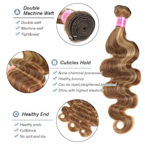 Marca: Luduna Tipo de item: pacotes ondulados Cor do cabelo: 4/27 Destaque Material: 100% mechas de cabelo humano não processado Trama de cabelo: trama dupla reforçada à máquina, acabamento requintado. - Material do cabelo: 100% cabelo humano ondulado virgem não processado, cortado diretamente de doadores de meninas, pode ser tingido, tingido, descolorido ou estilizado como seu próprio cabelo - Vantagem do cabelo: feixes de ondas corporais 4/27, extremidade completa e grossa, macio e suave, sem queda, sem emaranhado, sem cheiro estranho, aparência natural e super bonita. Pode segurar bem os cachos - Qualidade do cabelo: feixes ondulados loiros brasileiros de grau 12A, trama de máquina dupla, alta elasticidade e saltitante, amarrado à mão, firme e limpo, macio e brilhante, cheio e suave com pontas de cabelo saudáveis - Comprimento e peso do cabelo: mechas onduladas de cabelo humano com destaque marrom ombré, fiel ao comprimento e peso total, 35 a 76 cm para mechas de cabelo brasileiro, 95 g - 100 g/feixe. 3 mechas podem ser suficientes para uma cabeça inteira. Usar 4 mechas deixará o cabelo mais cheio e mais espesso - Adequado para qualquer ocasião: mechas onduladas de cabelo humano com destaque ombré, adequado para viagens, casamentos, festas, encontros, vestido chique, Halloween, meninas preguiçosas, trabalho diário ou treino, como presente, cosplay ou qualquer outra ocasião que você queira