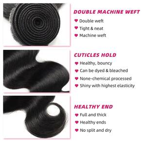 - Pacotes de ondas corporais cor de cabelo humano: feixes de cabelo humano de cor preta natural, podem ser tingidos e descoloridos. Combina perfeitamente com o seu cabelo, fica mais realista e bonita. 3-4 mechas de cabelo humano, geralmente é suficiente para a cabeça inteira. Pode ser alisada, com permanente, destacada, enrolada ou estilizada como seu próprio cabelo