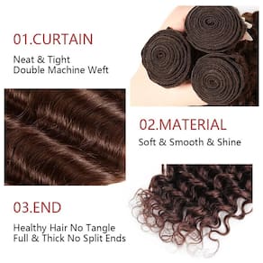 WuvuSnm Feixes de cabelo humano ~ proporcionam uma melhor experiência! 1. Material: Cabelo humano virgem brasileiro não processado. 2. Tipo de extensão de cabelo: Extensões de cabelo humano ondulado profundo. 3. Textura: Pacotes de ondas profundas. 4. Tipo de cabelo humano: Cabelo humano Remy brasileiro. 5. Trama do cabelo: Trama usinada dupla, sem emaranhamento, sem queda. 6. Cor do cabelo: os feixes são de cor marrom escuro, cor nº 4. 7. Comprimento do cabelo: Feixes de cabelo de 20 a 86 cm, feixes de ondas profundas fiéis ao comprimento. 8. Peso do cabelo: 3 mechas de cabelo ondulado, 100 g/pacote, 300 g no total. FQA: P1: Como evitar emaranhamento ou queda de cabelo? A1: suas extensões de cabelo podem ficar emaranhadas devido à secura, acúmulo de gordura e sujeira. Lave o cabelo com um bom xampu e condicionador e penteie suavemente o cabelo com os dedos. Certifique-se de limpar e aparar pelo menos uma vez por semana. P2: Quantos mechas eu preciso para uma cabeça inteira? R2: Normalmente 3 mechas são suficientes para uma cabeça inteira. - ?Material dos feixes castanho-escuro?: Feixes de cabelo humano virgem brasileiro ondulado profundo não processado. Macio e elástico. - ?Vantagem dos pacotes marrom?: Trama de máquina dupla, firme e limpa, sem queda, sem emaranhados, sem cheiros, fácil de pentear e modelar. - ?Detalhes do pacote de ondas profundas marrom?: marrom escuro, cor nº 4, 95-105 g/feixes, 20 a 86 cm, peso total e fiel ao comprimento. - ?Escolha perfeita?: Bonito e moderno, conforto e durabilidade de longa duração, adequado para qualquer ocasião, perfeito para sua coleção de itens essenciais do dia a dia. - ?Nosso serviço?: A Amazon Logistics oferece a você um melhor prazer. Se você tiver alguma dúvida, estaremos à sua disposição a qualquer momento