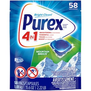 - Este pacote inclui uma bolsa de 58 pacotes de detergente de roupa Purex 4 em 1 com fragrância Mountain Breeze, o suficiente para 58 cargas.