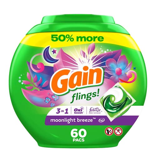 Gain Flings! Sabonete detergente para roupas compatível com HE 60 ct perfume de longa duração brisa luar