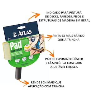 PAD COM CABO PARA RECORTE E ACABAMENTO EM PINTURAS REF: AT750/80MARCA: ATLAS•DESCRIÇÃO DO PRODUTO:-PAD flocado com cabo ajustável em 360° com rosca.-O PAD com cabo para recortes e acabamento em pinturas da Atlas é uma excelente ferramenta paraarremates em recortes, aberturas, rodapés e marcos de portas e janelas. -Possui um cabo que rotaciona 360 graus e permite uma maior liberdade de movimentos, facilitando a pintura dos arremates. -A lã sintética proporciona um ótimo acabamento e os rodízios um alinhamento perfeito da pintura.-O PAD com cabo é indicado para todos os tipos de tintas quando aplicadas em superfícies lisas.•INDICAÇÃO DE USO:Indicado para pintura de recortes e cantos de paredes e aberturas em geral. Ideal para aplicação com tinta acrílica, esmalte e pva em superfície lisa.•DIMENSÕES:-Comprimento: 17cm-Largura: 12cm-Altura: 7cm•COMO USAR:-Utilize uma bandeja para carregar uniformemente o PAD com o produto desejado. Retire o excessode tinta no PAD utilizando a bandeja.-Aplique a tinta encostando os rodízios na parede, rodapé ou marco que será o guia para o recorteperfeito na sua pintura.-Após a pintura, retire o PAD da base para limpá-lo ou descarte-o, substituindo-o por outro PADrefil.(AT750/35)-Para pintura em áreas de difícil acesso, o cabo do PAD pode ser utilizado em conjunto com umprolongador.•ANTES E DEPOIS DE USAR:-Com produtos base água: lavar e enxaguar com água.-Com produtos base solvente: lavar e enxaguar com solvente. PAD PARA PINTURA COM CABO PLASTICO DESCRIÇÃO DO PRODUTO:Pad de espuma poliéster e lã sintética com cabo ajustável com rosca.INDICAÇÃO DE USO:Indicado para pintura de decks, paredes, pisos e estruturas de madeira em geral. Ideal para aplicação com stains, vernizes e outros produtos para tratamento de madeiras.