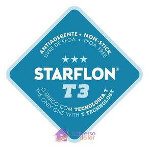 Corpo de alumínio com acabamento externo lixado. Espessura da peça de 3 mm: distribuição uniforme do calor. Revestimento interno de antiaderente Starflon T3. O único com a tecnologia T: maior poder de antiaderência; maior resistência à abrasão; maior durabilidade; mais fácil para limpar e livre de PFOA, garantindo uma resistência à abrasão mais de 15.000 ciclos baseado na Norma ABNT NBR 15321:2013. Alças rebitadas de aço cromado. Maior segurança e estabilidade durante o uso.