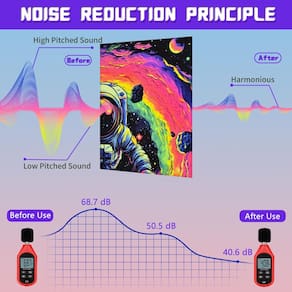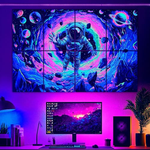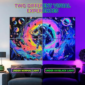 - UV/BLACK LIGHT REACTIVE ACOUSTIC PANELS: Tutmyrea 2025 new launched the blacklight art acoustic panels, uses heat transfer printing technology to print a astronaut spacewalk pattern. UV reactive ink is used to create a stunning vastness and mystery atmosphere of the under UV/black light lamp reaction.