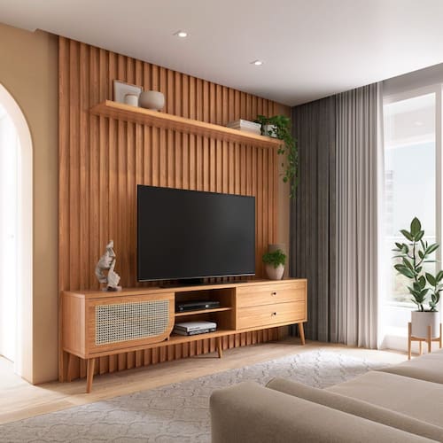 Destaques do Produto: Design moderno com painel ripado e detalhes em palha natural