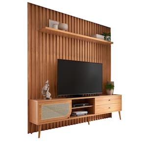 O painel ripado de 223,5cm acomoda TVs de até 75 polegadas, proporcionando um visual moderno e sofisticado. O rack de 220cm possui duas gavetas espaçosas e uma porta de correr com acabamento em palha natural, oferecendo praticidade e charme ao móvel.