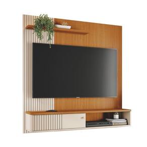 Porta deslizante, painel lateral e porta em MDF frisado (baixo relevo), puxador pontual dourado fosco, prateleira superior com borda frontal chanfrada, painéis em MDP de 15 e 25mm. Produto desenvolvido para ser fixado na parede. O televisor deve ser fixado no painel. Suporta TVs de até 65.