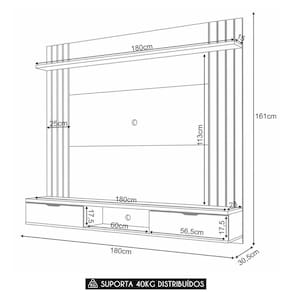 Ele é ideal para de até 70 polegadas fixada no painel, garantindo uma visão confortável e uma decoração moderna. Ele tem detalhes laterais ripado, que dão um toque de charme e elegância ao ambiente. Além disso, o painel conta com tampo e prateleira superior com espessura de 25mm, que oferecem resistência e 1 nicho para objetos decorativos ou eletrônicos. O Painel Suspenso também tem duas portas basculantes com dobradiças metálicas, que facilitam a abertura e o fechamento. As portas têm puxador em poliestireno com acabamento na cor champanhe, que combinam com o Design Moderno. O painel é produzido em MDP e MDF de 25mm e 15mm, que garantem durabilidade e qualidade ao produto.