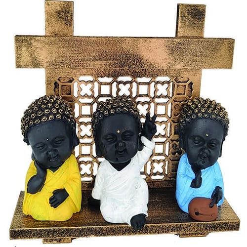 Este Kit contém 4 peças: - 3 Mini Buda Cores de 10 cm de altura - 1 Aparador exotérico vazado no tamanho de 18cm de altura x 20cm de largura x 7cm de profundidade