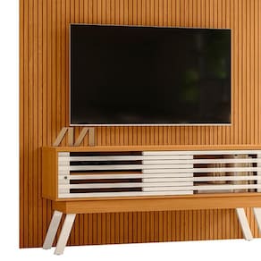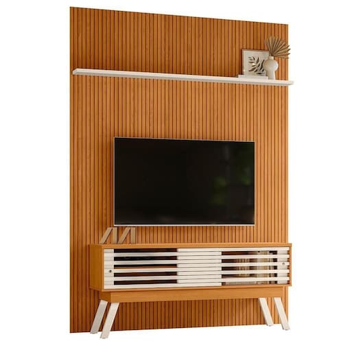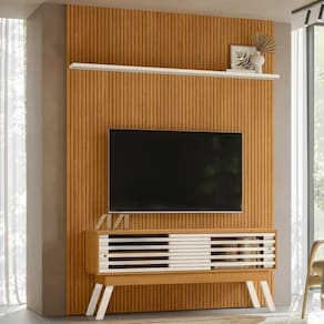 Painel e Bancada Panorama, conjunto atual que propõe um visual moderno e funcional para o seu lar. Estrutura em MDP/MDF com acabamento em pintura UV texturizada, suporta TVs de até 65 polegadas. Conta com portas de correr com sistema de abertura por trilho plástico, frisos do chão ao teto (MDF baixo relevo), prateleira superior e interna, além de 4 pés estilo retrô (em plástico). Fixação feita por parafusos. Este produto será entregue em 4 volumes.