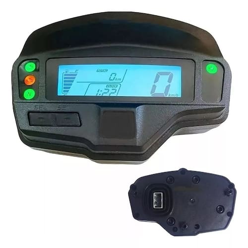 - **Funções:** Indicador de velocidade, hodômetro, marcador de combustível, luzes indicadoras (setas, neutro, farol alto, etc.)